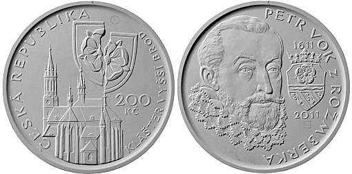 400. výročí úmrtí Petra Voka z RožmberkaČNB představila výsledky soutěže na umělecký návrh pamětní stříbrné dvousetkoruny ke 400. výročí úmrtí Petra Voka z Rožmberka. Jako nejvhodnější k ražbě bankovní rada označila kombinaci lícní strany návrhu pana Jaroslava Bejvla a rubové strany návrhu Mgr. Petra Horáka. Emise mince je naplánována na 19. října 2011.