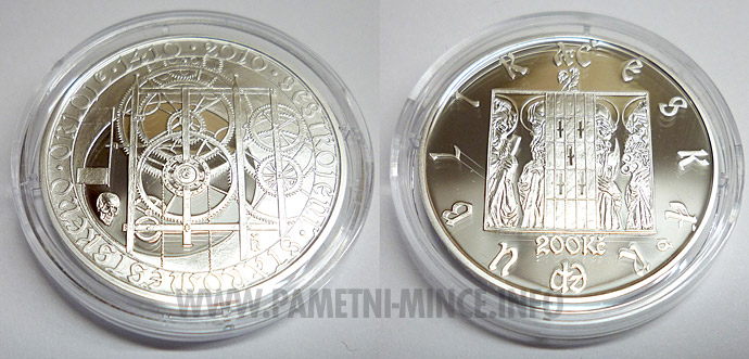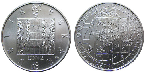 Dnem 17. března 2010 vydává Česká národní banka do oběhu pamětní stříbrnou dvousetkorunu k 600. výročí sestrojení významné pražské památky, Staroměstského orloje. Dvousetkoruna je ražena ze slitiny obsahující 900 dílů stříbra a 100 dílů mědi a vydává se ve dvojím provedení, v běžném a špičkovém (proof), které se liší povrchovou úpravou a provedením hrany. U mincí špičkové kvality je pole mince vysoce leštěné a reliéf je matován, hrana je hladká s vlysem „ČESKÁ NÁRODNÍ BANKA * Ag 0.900 * 13 g *“. Mince běžné kvality mají hranu vroubkovanou. Průměr mince je 31 mm, hmotnost 13 g a síla je 2,3 mm. Stejně jako u každé ražby mincí jsou i u těchto mincí povoleny odchylky v průměru 0,1 mm a v síle 0,15 mm. V hmotnosti je povolena odchylka nahoru 0,26 g a v obsahu stříbra odchylka nahoru 1%.
