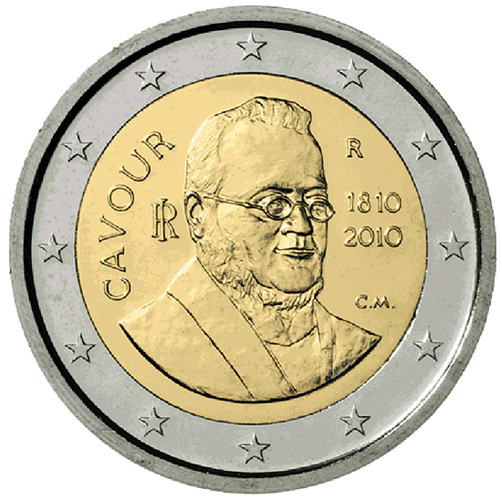 Italský politik Camillo Benso, hrabě Cavour se narodil v roce 1810 a Itálie si 200. výročí připomene vydáním pamětní dvoueurové mince. Mince by měla být uvedena do oběhu v březnu 2010 v počtu 2 mil. mincí.