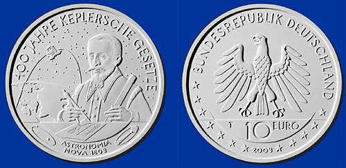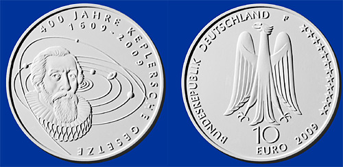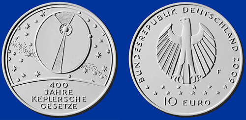 Německá stříbrná euromince k 400. výročí formulování Keplerových zákonůMimo české pamětní mince připomene 400. výročí formulování Keplerových zákonů také německá stříbrná euromince. Vítězný návrh mince je od Ulricha Böhmea. Stříbrné destieuro vychází 7. května v nákladu 200 000 mincí.