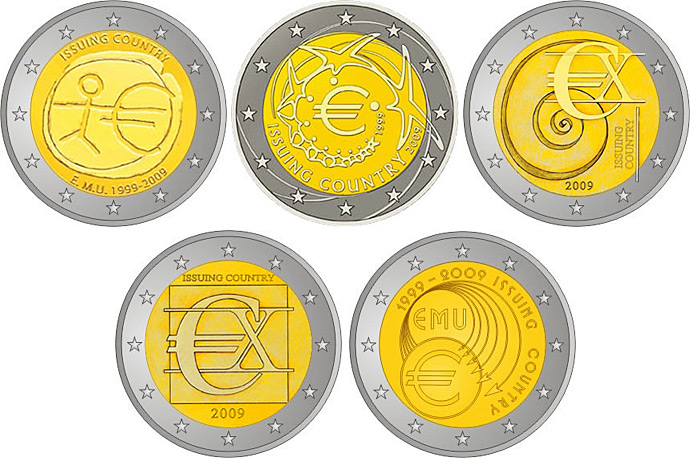 V lednu 2009 vydáváji členské státy Eurozóny pamětní 2 euro minci k příležitosti 10. výročí Hospodářské a měnové unie.